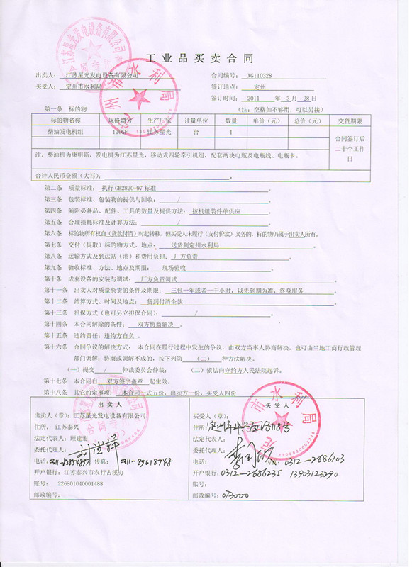 為保證應急供電系統(tǒng),經(jīng)雙方溝通協(xié)商,定州市水利局與星光石家莊分公司簽訂供貨合同。根據(jù)合同,定州市水利局從星光訂購了一臺120KW柴油發(fā)電機,選用的是康明斯柴油機配備江蘇星光發(fā)電機。