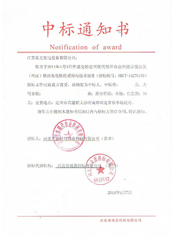 2014年4月7日,江蘇星光動力集團河北分公司成功中標,成為河北首農現代農業科技有限公司柴油發電機組的供貨商,為其提供動力支持。