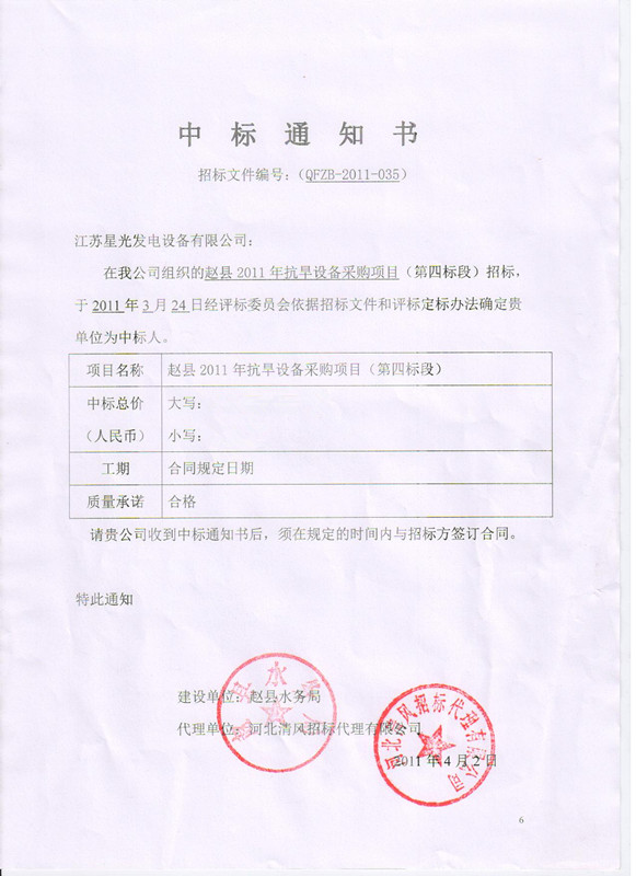 星光動力集團河北分公司通過自身實力的展示,獲得了由趙縣水務局委托河北清風招標代理有限公司招標的趙縣水務局抗旱設備采購項目(第四標段)中標通知書。