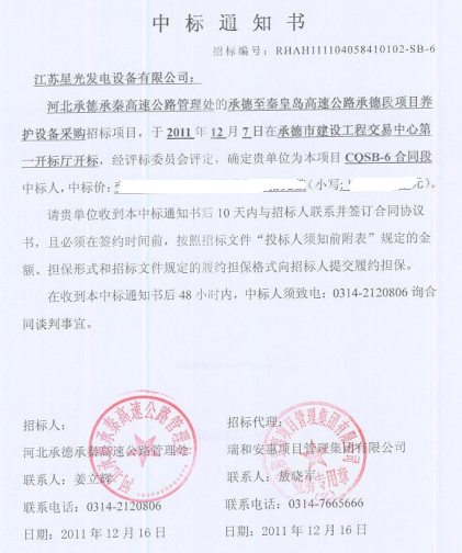 江蘇星光發電設備有限公司 >> 新聞動態 >> 中標通告 >> 星光成功中標河北承德承秦高速公..