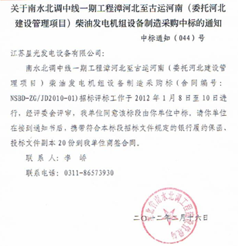 2012年2月16日,星光公司在強手如林的競標企業中脫穎而出,一舉中標南水北調中線一期工程漳河北至古運河南柴油發電機組設備采購項目,為南水北調工程提供可靠的動力保障。