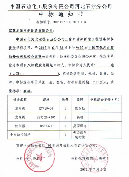 2012年6月28日,中國石化河北承德石油分公司三岔口油庫擴建工程經過慎重選擇和比較,最終確定與星光發電設備公司進行合作,確定星光為中石化工程八標段發電機組中標人。